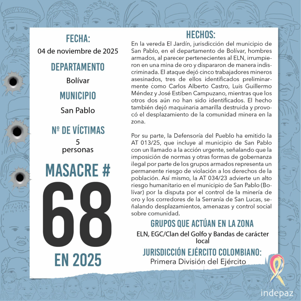 Indepaz ha catalogado este violento hecho como la masacre 68 que se registra en Colombia en lo que va del 2025, siendo Bolívar, Cauca y Valle del Cauca los departamentos que figuran en la cabeza de territorios